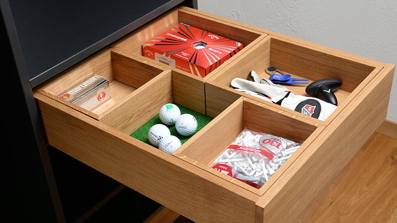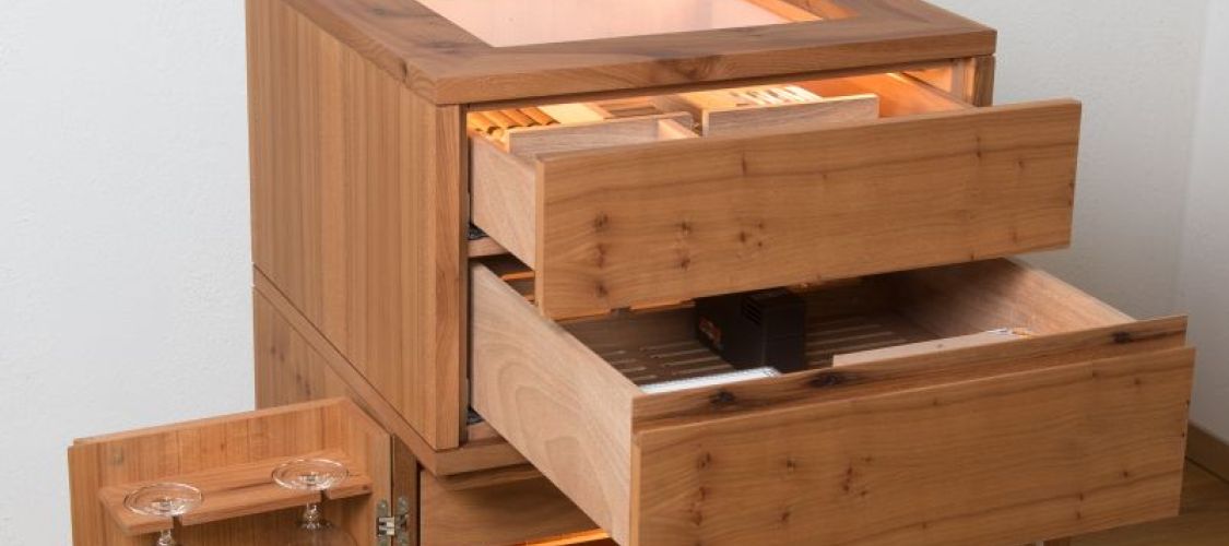 Zwei Innenauszüge bieten Platz für die Cigarrenutensilien und die edlen Tropfen.